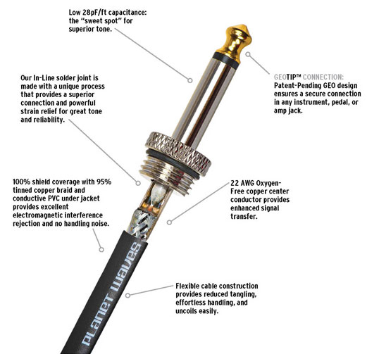 Planet Waves American Stage Instrument Cables sah ich u.a. als ich Warren Haynes und Robben Ford traf. Diese Instrumenten- und Lautsprecher-Kabel bieten eine sehr solide Preis-Leistungs-Relation. Ich empfehle, sie von hinten durch das untere Ende des Gurts zu führen und dann erst in die Buchse zu stecken, um so die Zuglast auf das Kabel (insbesondere nahe dem Stecker) und auch auf die Klinkenbuchse deutlich zu reduzieren. Um den gleichen Effekt beim Verstärker zu erzielen wird das Kabel am besten durch den Griff geführt und am der Eingangsbuchse nächst gelegenen Ende in den Griff geklemmt. Die Preisangaben beinhalten die gesetzl. MwSt.
